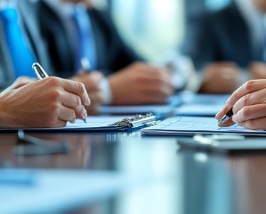 Business owners signing documents for company registration in Dubai.